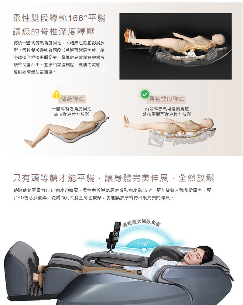 最大躺臥角度為166°舒適平躺 放鬆人體背脊壓力