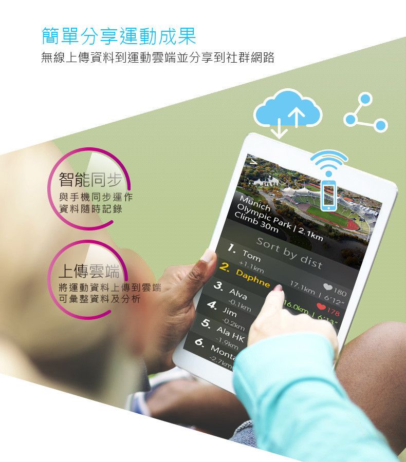 顯示資訊 時間、距離、步數、步速、步頻、步幅、坡度、速度、卡路里、心率與圈數