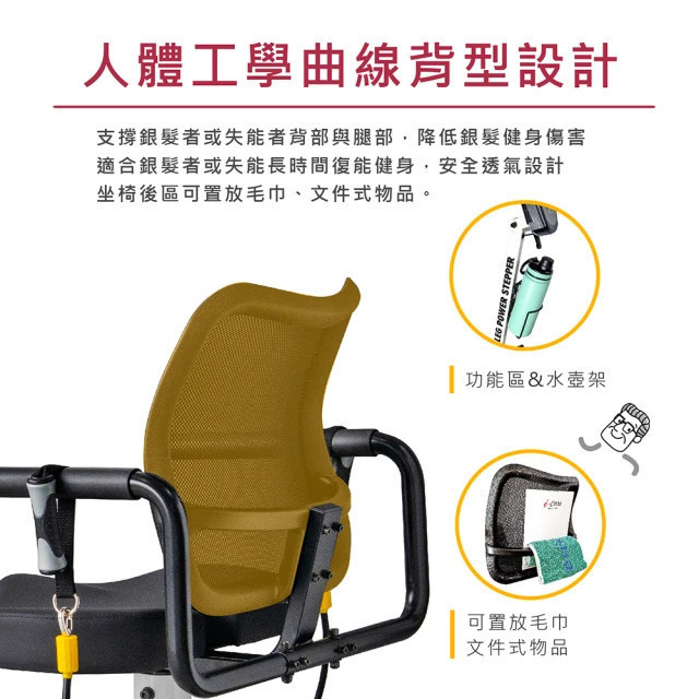 肌力座式訓練,下肢踏步設計應用運動型升降大座墊及可維持線性角度左右腿力的不同阻力訓練,提升下肢訓練安全性及舒適感、降低關節負擔、跨乘危險、提高腿力訓練、低重心機身穩定度高,搭配阻力帶上肢訓練,透氣人體工學健身座椅,能在室內展開安全復健肌力座式訓練。
