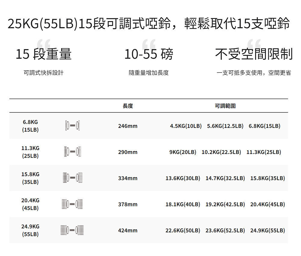 啞鈴長度隨重量作改變,不受固定長度牽絆