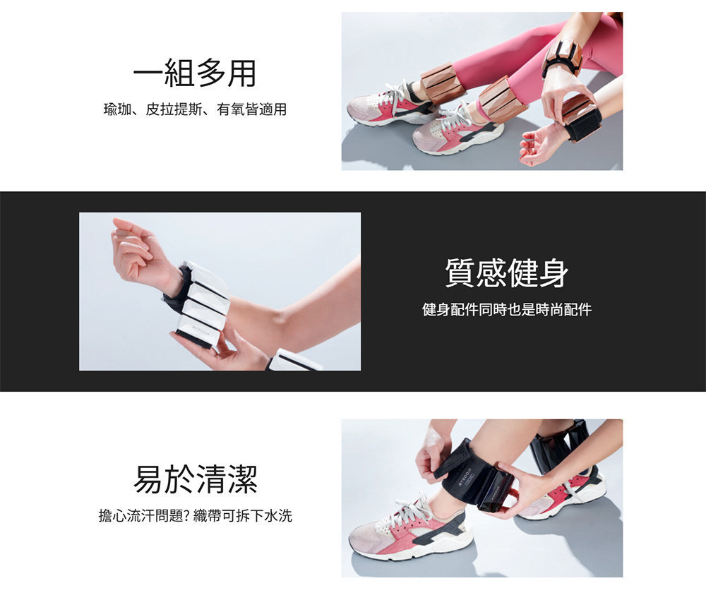 內 含:Weighted Bracelet 重量手環1Kg x2、調整織帶 x2、專屬收納袋 x2。