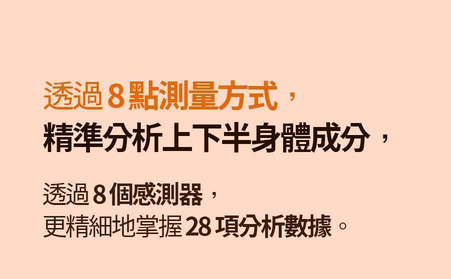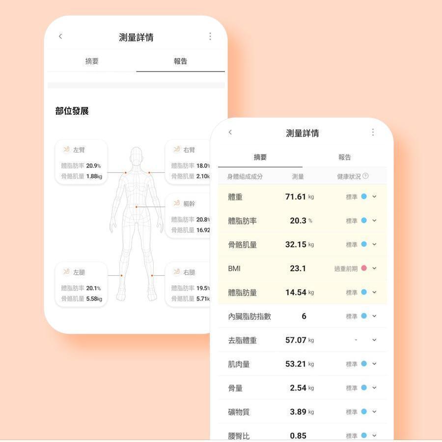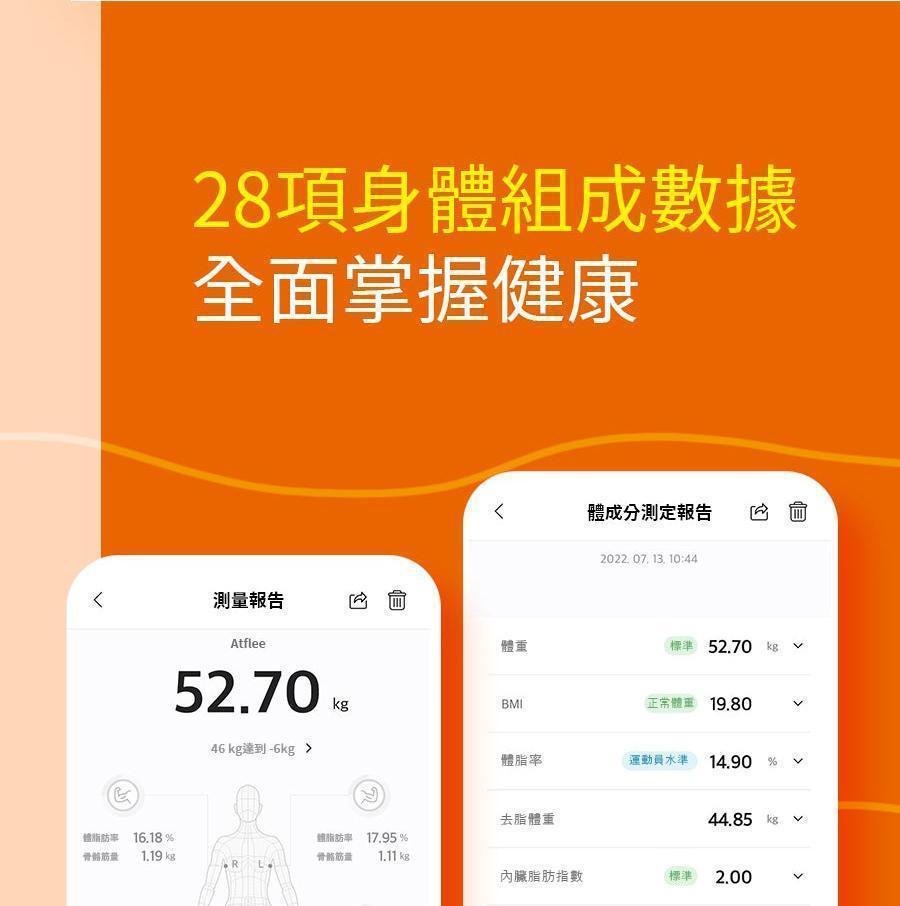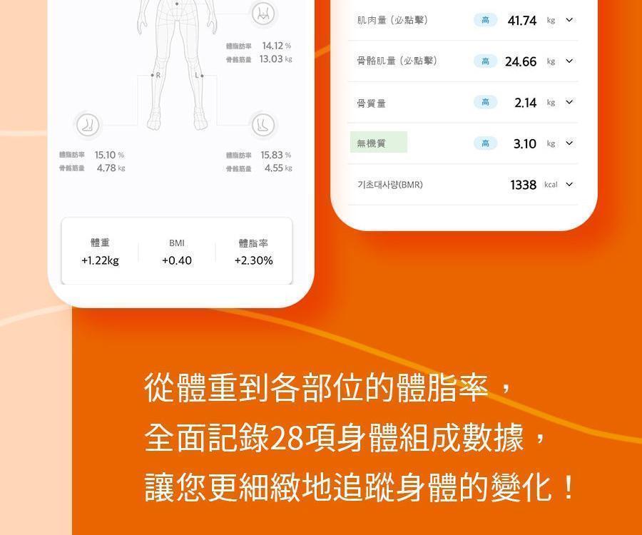 • 紀錄並管理28項身體數據:體重/BMI/體脂率/去脂體重/內臟脂肪指數/肌肉量/骨骼肌量/骨質量/礦物質/基礎代謝率 (BMR)/身體年齡/腹部肥胖率 /體脂肪量/體水分/體蛋白質/標準體重/肥胖程度/肥胖度,等多項身體指標