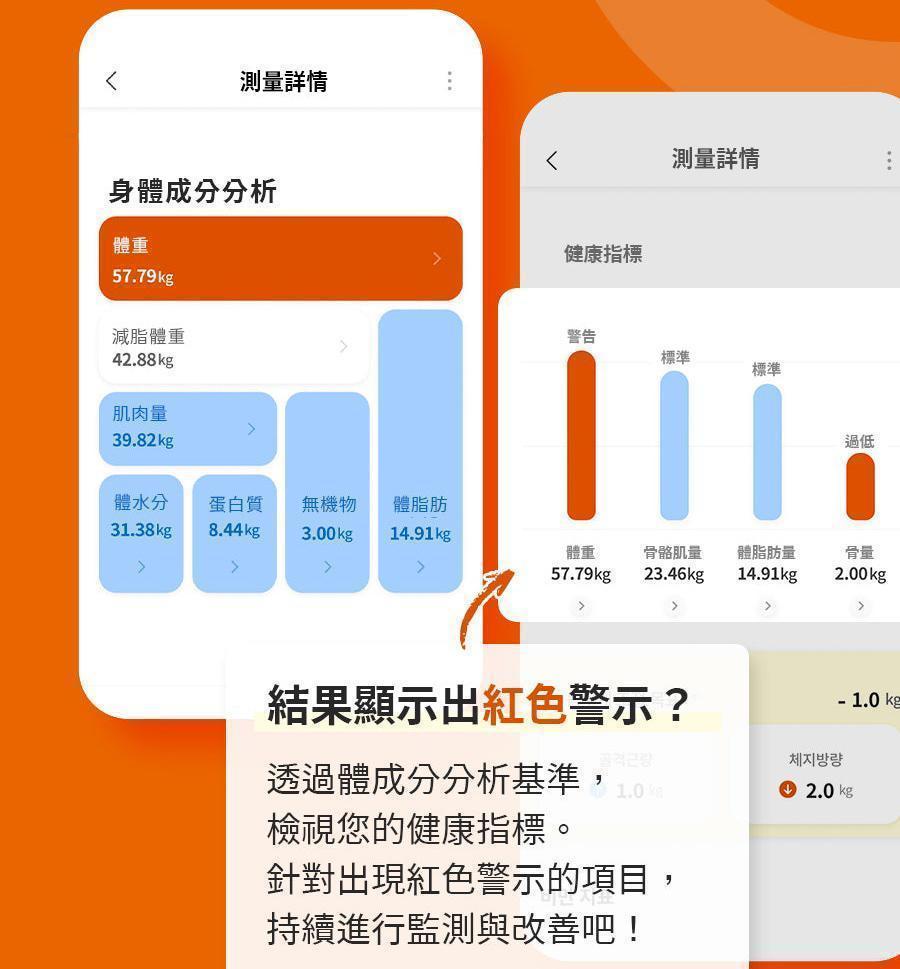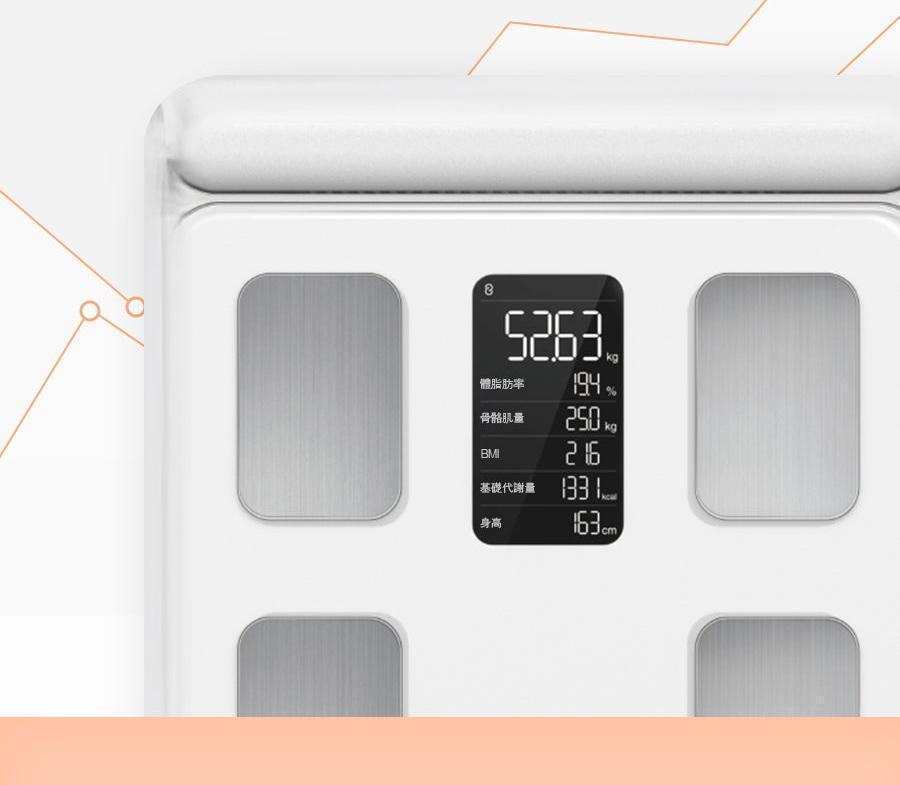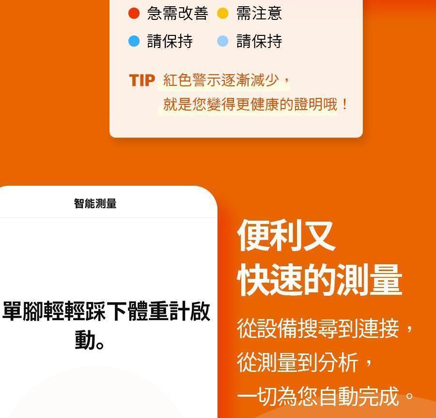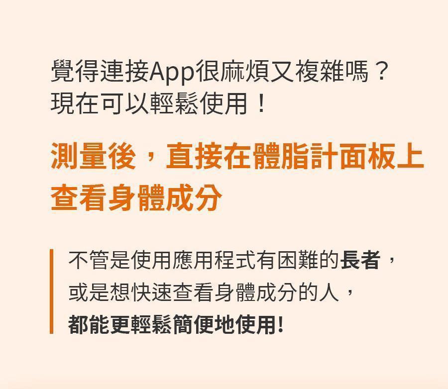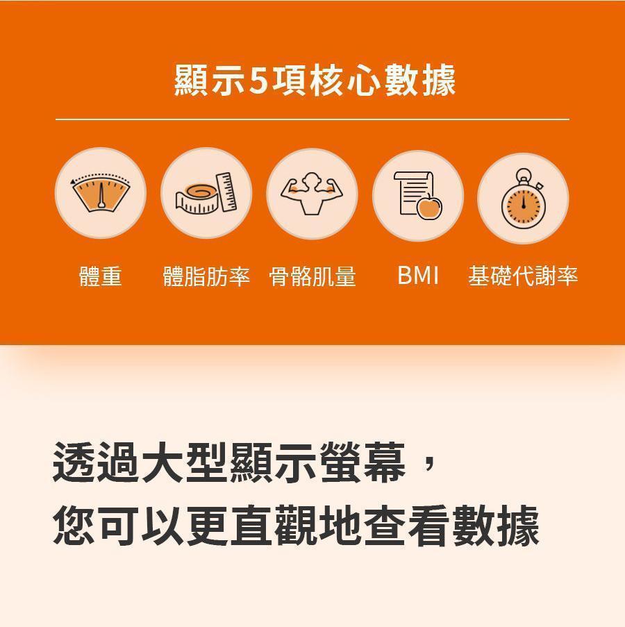 • 4.8吋大螢幕直接看五項核心數據:體重/BMI/體脂率/骨骼肌量/基礎代謝