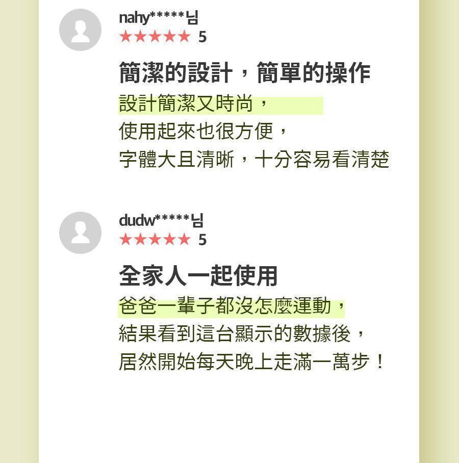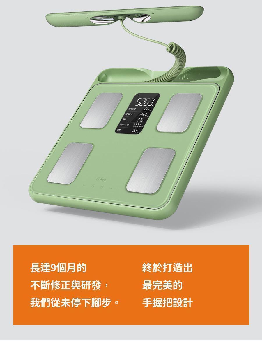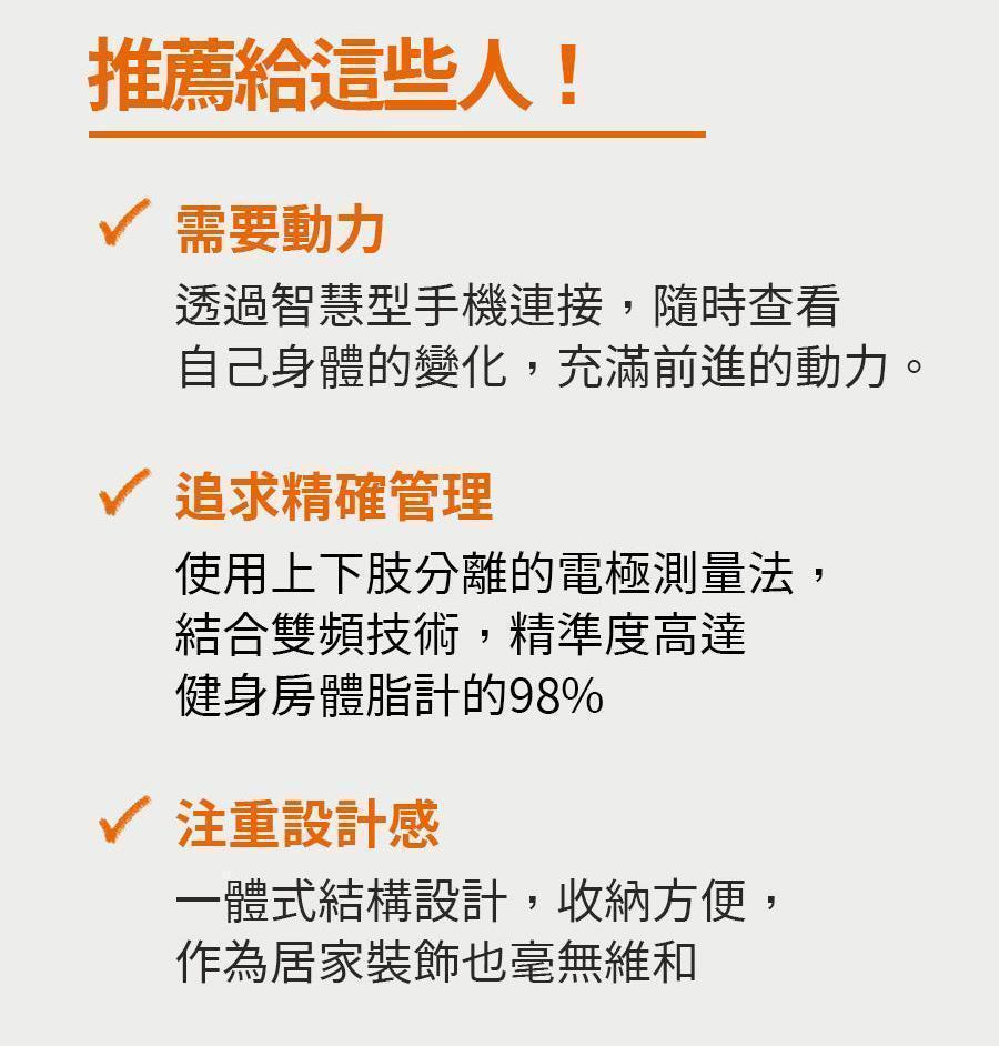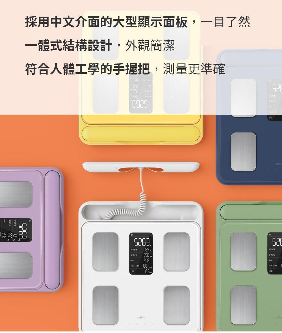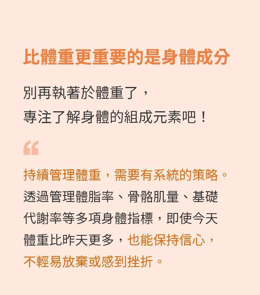• 4.8吋大螢幕直接看五項核心數據:體重/BMI/體脂率/骨骼肌量/基礎代謝